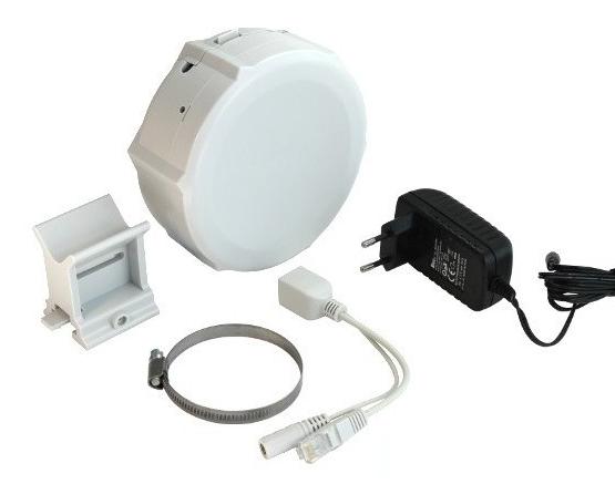 Package contains: SXT wireless device with integrated antenna, pole mounting bracket, mounting ring, PoE injector, power adapter, quick setup guide
