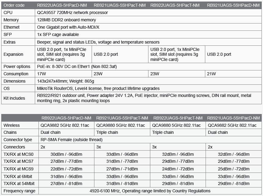 Systémové řešení platforem firmy MikroTik pro poskytovatele bezdrátového připojení k síti Internet. Aktivní prvky standardu 802.11ac umožňují dosažení až 540Mbit reálné přenosové rychlosti (866Mbit datarate). Jsou podporovány 20/40/80MHz kanály a 256-QAM modulace. Zařízení podporuje client mode (CPE), point-to-point a point to multipoint (AP) mody a je zpětně kompatibilní s 802.11an prvky. NetMETAL je robustní voděodolná jednotka v kovovém pouzdře pro nasazení i v těch nejnáročnějších klimatických podmínkách. Robustní kovové tělo jednotky zajišťuje vynikající termoregulaci instalované elektrotechniky pracující na vysokých výkonech. Unikátní provedení pouzdra umožňuje snadnou manipulaci pomocí jedné ruky tam, kde není od věci se druhou raději přidržovat ;o) Jednotky jsou dodávány s předinstalovaným a aktivovaným operačním systémem RouterOS V5 L4, součástí dodávky je montážní příslušenství k instalaci na stožár či na DIN lištu, napájecí zdroj 24V s POE NetMETAL je osazen: - výkoným procesorem 720Mhz CPU - 128MB RAM pamětí - jedním Gigabit Ethernet portem - 802.11ac radiovým modulem - SFP portem - USB portem - třemi RP-SMA konektory pro připojení externí antény. Součástí dodávky: - 1x outdoor jednotka - 1x montážní příprava k uchycení jednotky na stožár/konzoli - 1x montážní příprava k uchycení jednotky na DIN lištu - 1x napájecí zdroj 24V 1.2A - 1x POE injektor TECHNICKÉ SPECIFIKACE CPU: QCA9557 720MHz network processor Memory: 128MB DDR2 onboard memory Ethernet One Gigabit port with Auto-MDI/X SFP: 1x SFP cage available Extras: Beeper, signal and status LEDs, voltage and temperature sensors Expansion: USB 2.0 port Power options PoE-in: 8-30V DC on Ether1 (Non 802.3af) Consumption: 23W Dimensions: 143x247x48mm; Weight: 865g OS: MikroTik RouterOS, Level4 license, free product lifetime upgrades Wireless: QCA9882 5GHz 802.11ac Chains: Dual chain Connector: 3x RP-SMA Female (outside thread) Kit includes: - RB922/R921 outdoor unit - Power adapter 24V 1.2A - PoE injector - miniPCIe mounting screws - DIN rail mount - metal monting ring - 2x plastic mounting loops ! UPOZORNĚNÍ ! Výrobce Mikrotik neposkytuje záruku na zařízení poškozená přepětím. Zařízení je třeba adekvátně chránit proti indukovanému elektrostatickému přepětí či přepěťovým špičkám na silovém vedení. Pro venkovní instalace používat výhradně stíněnou kabeláž (FTP/SFTP) a jednotky korektně uzemnit (prostřednictvím integrovaného zemnícího členu či použitím ethernetové přepěťové ochrany).