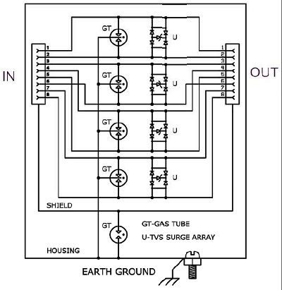 • All 4 pairs are protected by the reliable differential Gas Discharge Tube (GDT) and the bi -directional Transient Voltage Suppressing (TVS) array