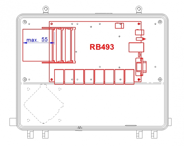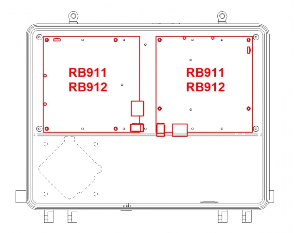 • V boxu je příprava pro snadnou montáž desek MikroTik: RB 411, RB911, RB912, RB433, RB493, ostatní pomocí vloženého plechu (není součástí balení)