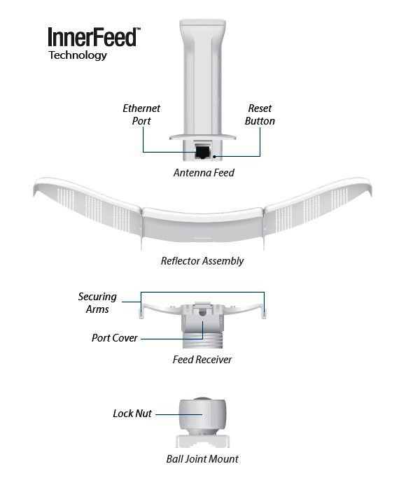 Patentovaná technologie InnerFeed integruje celou rádiovou část přímo do zářiče, který je krytý vysoce odolným UV stabilizovaným plastem.
