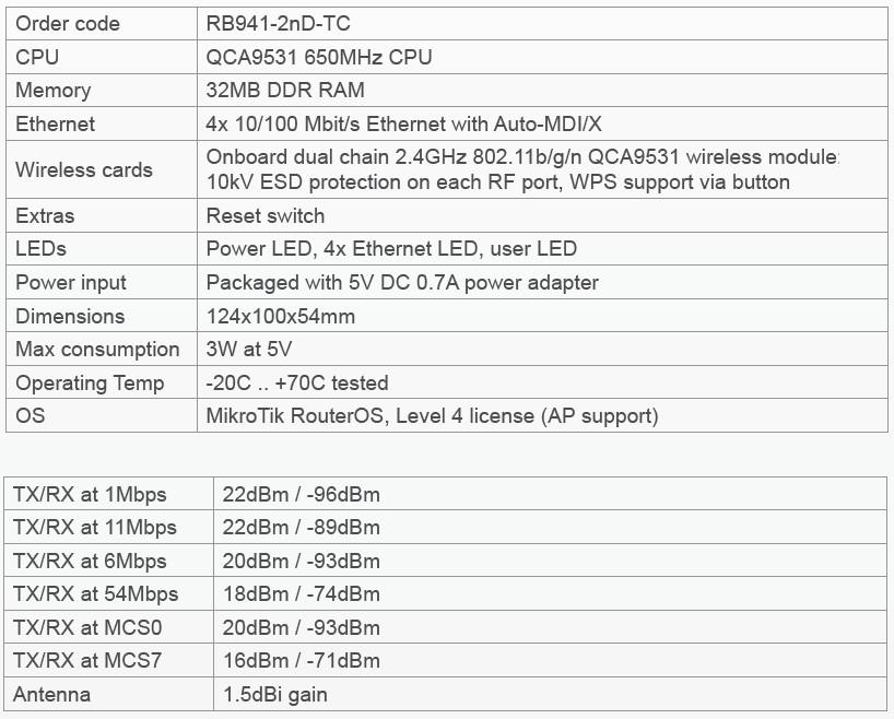 Osazeno 650MHz CPU, 32MB RAM, disponuje čtyřmi Fast Ethernet porty, integrovaný Dual-Chain 2.4GHz bezdrátový modul a RouterOS L4 licence.