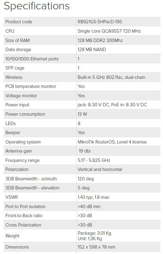 Výroba modelu končena, produktový nástupce/ekvivalent: RB921GS-5HPacD-15S nebo RBD22UGS-5HPacD2HnD-15S a v případě potřeby 19dbi antény RB922UAGS-5HPacD-NM + MTAS-5G-19D120 .