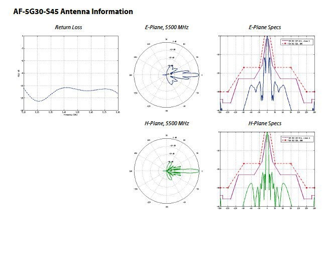Anténa má duální lineární polarizaci pootočenou o 45°. Úhel vyzařování v obou polarizacích je 5,8° (3dB).