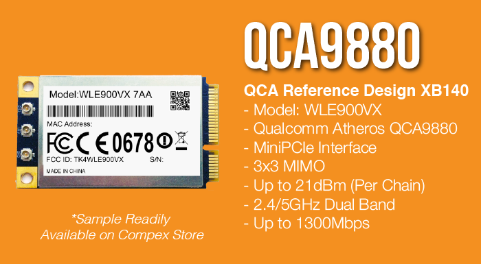 COMPEX • WLE900VX • miniPCIe module, AR9880, 802.11ac/a/b/g/n , 3*3MIMO, 3*ufl, 2,4/5GHz
