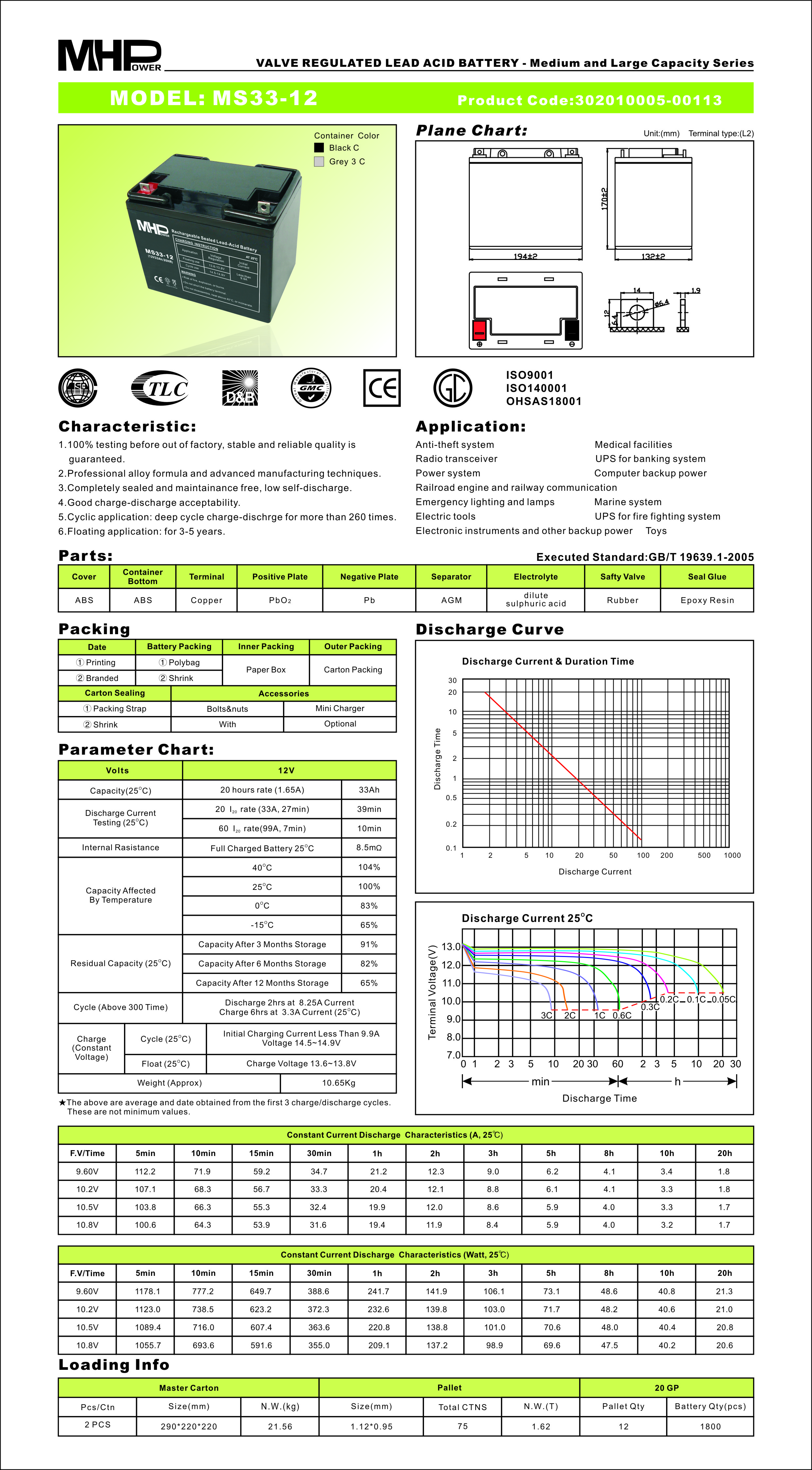 MHPower battery • MS33-12 • Hermetizovaný Pb akumulátor VRLA AGM 12V/33Ah