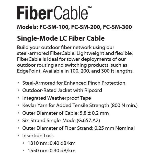 FC-SM-100 je 30ti metrový venkovní single mode optický kabel s 6ti předvyrobenými LC konektory na každé straně.