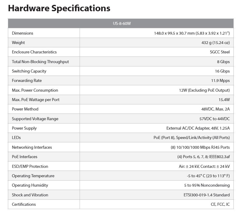 UniFi Switch US-8-60W je ideální pro menší instalace hotspotového systému UniFi, které požadují výkonný switch s managementem ve stolním provedení.