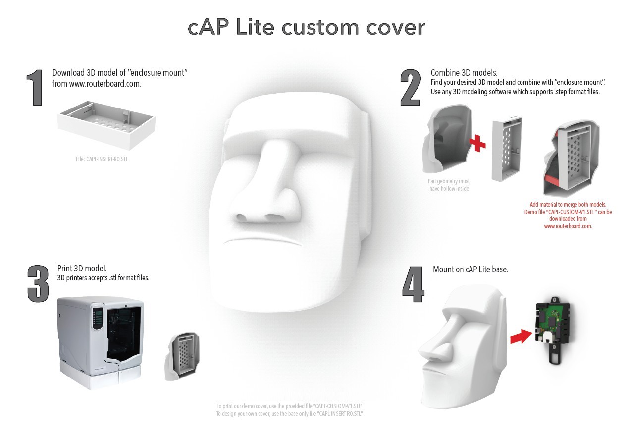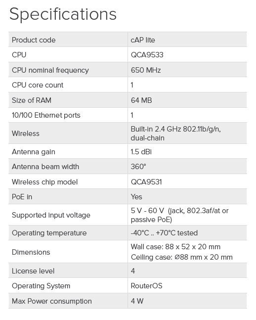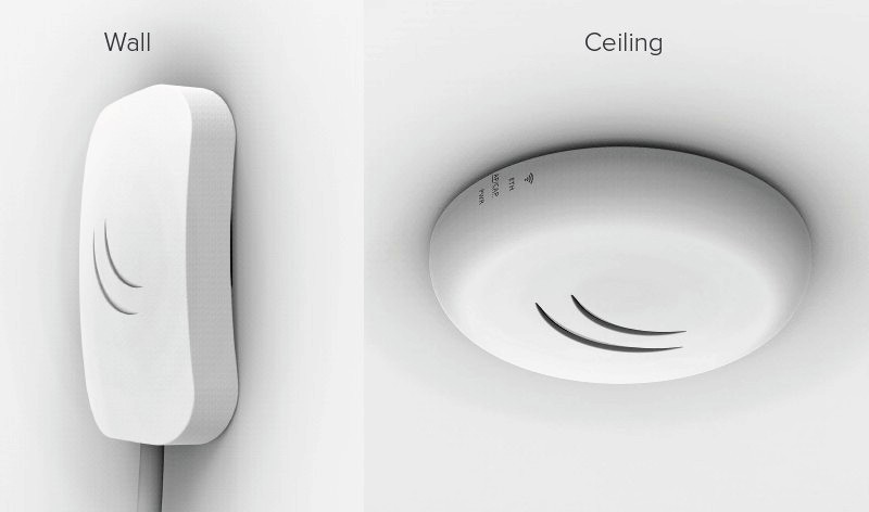 cAP lite je designové ápéčko disponující kompletním servisem RouterOS funkcí a je dodáváno s dvěma verzemi krytu pro montáž na strop či na stěnu.