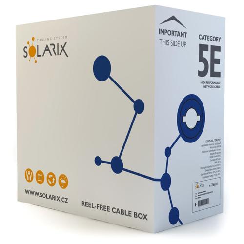 Tento instalační kabel s označením SXKD-5E-FTP-PVC je spolehlivou součástí produktové řady Solarix - CAT5E. Společně s ostatními komponenty systému strukturované kabeláže Solarix vytváří řešení, které zaručuje dlouhou životnost, maximální výkon a bezproblémový chod počítačové sítě. Instalační kabely Solarix – kategorie 5E jsou určeny pro horizontální rozvody a jsou nabízeny ve stíněné i nestíněné verzi s různým typem pláště - tj. PVC, LSOH nebo UV stabilní PE. Tyto kabely bez problémů splňují požadavky definované v mezinárodních standardech ANSI/TIA/EIA 568, ISO/IEC 11801 a EN 50173 pro kategorii 5E a jsou vhodné i pro přenos dat rychlostí až 1 Gb/s (tj. gigabitový Ethernet). Stejně jako ostatní kabely Solarix, je i kabel SXKD-5E-FTP-PVC značen metráží po 1m v rozsahu od 0 do 305m. Kabel je dodáván ve vysoce odolném třívrstvém leštěném kartónovém boxu (vždy barevně odlišeném podle typu kabelu), na kterém jsou uvedeny všechny nezbytné produktové informace, včetně čárových kódů, výrobní šarže, popisu a nejdůležitějších technických parametrů (např. NVP v podobě QR kódu).