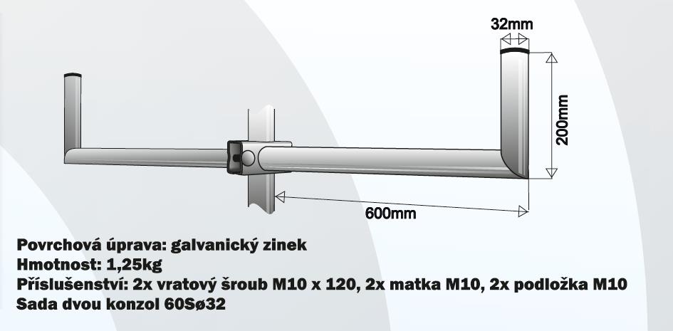 Sada dvou konzol vhodná k připevnění na stožár nebo svislou trubku, určena především pro uchycení datových a televizních antén na stožáry STA. Trubky jsou svařeny do pravého úhlu, odpadává tím nepoužitelné místo v ohybu. Pevný třmen zajistí pevné stažení, které zabrání pootočení. Vratové šrouby jsou dlouhé 120mm s délkou závitu 60mm.