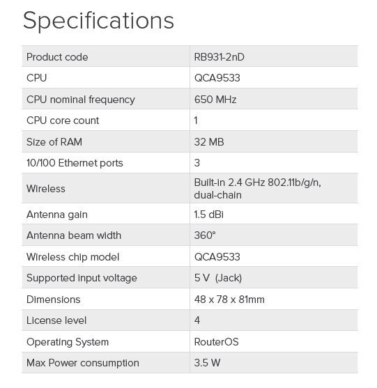Integrované dvě 1,5 dBi anténky pro pásmo 2,4GHz, předinstalovaná RouterOS L4 licence umožňující provozovat zařízení v režimu AP.