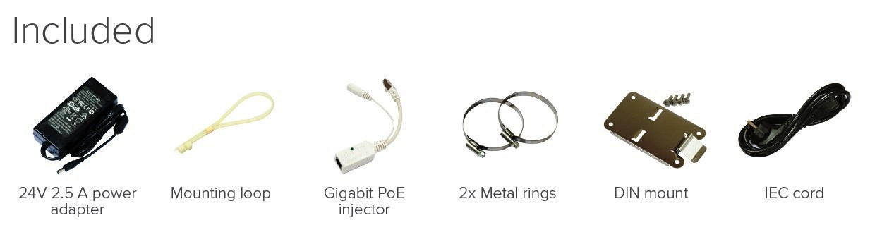 Napájení prvku prostřednictvím přiloženého výkonného 24V 2,5A zdroje přes jack, či prostřednictvím PoE in na portu 1 (Pasivní PoE).