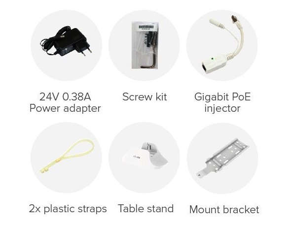 Součástí dodávky napájecí zdroj, PoE injektor, držák, instalační pásky a bezpečnostní šroub eliminující neoprávněné vniknutí do zařízení.