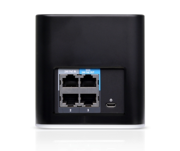 AirCube AC disponuje čtyřmi RJ45 porty - dva porty jsou PoE. Port PoE IN slouží pro napájení samotného routeru, port PoE Out podporuje pasivní PoE 24V na výstupu.