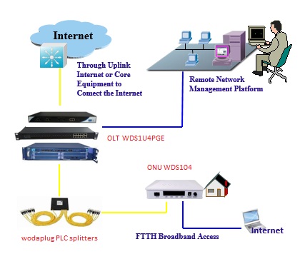 ONU WDS600-104GH spolu s OLT realizují flexiblní síťovou strukturu se snadnou údržbou a nabízí kompletní řešení pro FTTx. ONU WDS600-104GH má 1 PON port a 4*10/100/1000 M BASE-T porty .