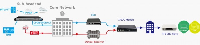 Jednoduše použitelné zařízení pro zapojení budovy k internetu po společném koaxiálním rozvodu. Umožňuje komunikaci mnoha jednotek po jediném koaxiálním vedení signálovou rychlostí až 700Mbps. Tento model má dva výstupy pro EOC, je tedy vhodný pro použití v místě kde se koaxiální rozvod rozvětvuje na dvě nezávislé části - například centrální uzel pro bytové domy.