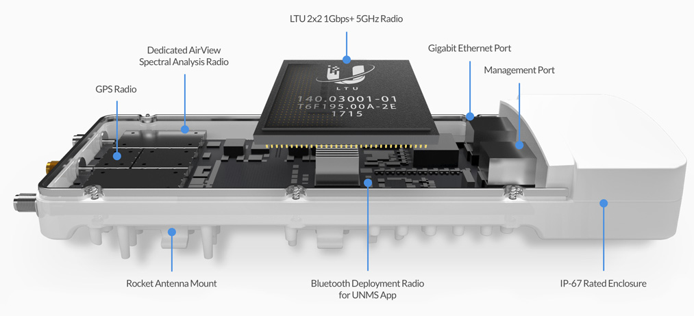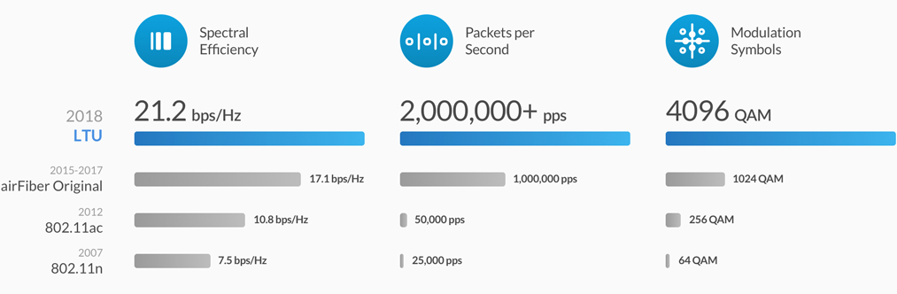 Revoluční procesor s označením airFiber LTU IC dokáže zpracovat přes 2 miliony+ paketů za sekundu při 1Gbps+ (TDD) reálného datového toku v bezlicenčním pásmu 5GHz při 1024QAM.
