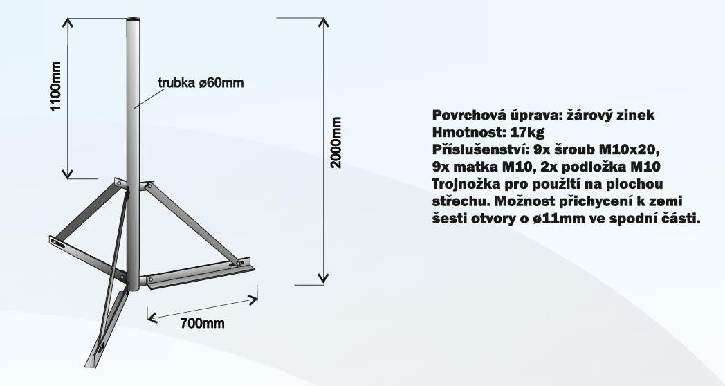 Robustní trojnožkový stožár o výšce 1,2m s trojúhelníkovou základnou.