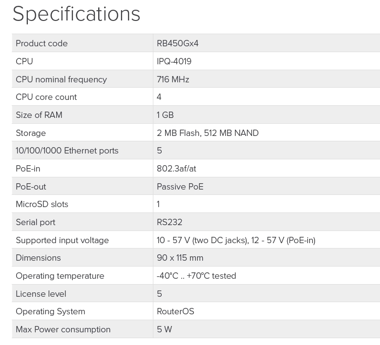 RouterBOARD RB/450G osazený 5x Gigabit LAN rozhraním je poháněn čtyřjádrovým procesorem 716MHZ ARM CPU a disponuje 1GB RAM pamětí.