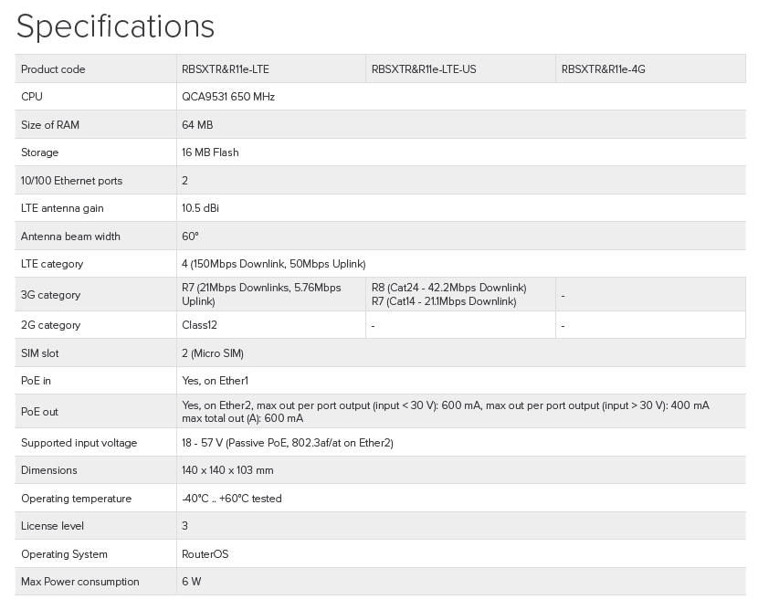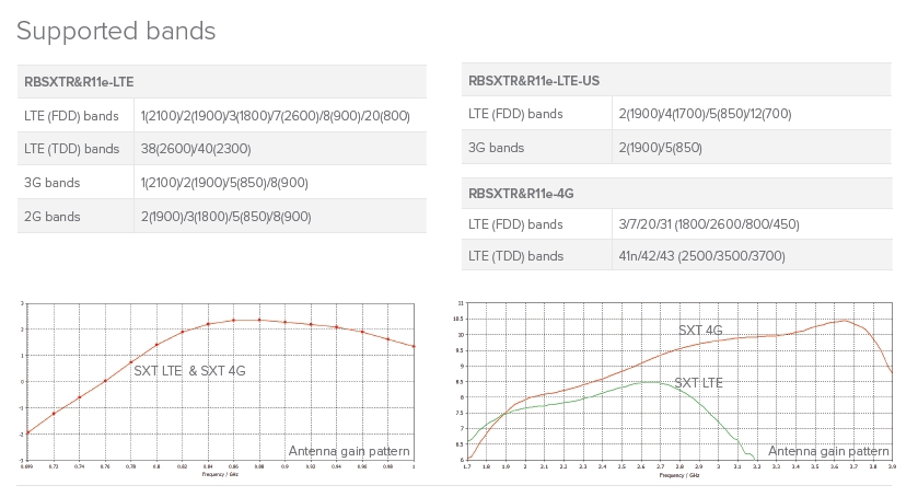 SXT 4G je 802.11b/g/n modelem řady SXT s integrovaným 4G modemem R11e-4G podporujícím LTE FDD pásma 3, 7, 20 a 31 stejně jako LTE TDD pásma 41n, 42 a 43.