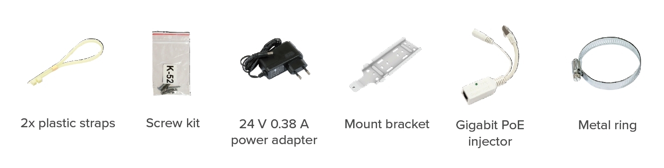 Součástí dodávky napájecí zdroj, PoE injektor, držák, instalační pásky a bezpečnostní šroub eliminující neoprávněné vniknutí do zařízení.