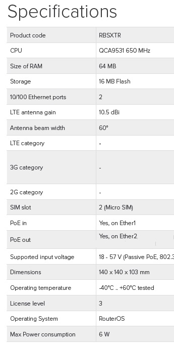 Systémové řešení platforem firmy MikroTik pro poskytovatele bezdrátového připojení k síti Internet. SXTR outdoor jednotka pro použití v 4G/LTE sítích, neobsahuje integrovaný modem tak aby bylo možné použít vlastní dle preference.