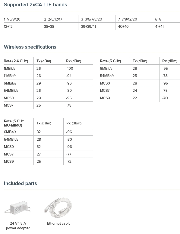 Integrovaná anténa pro 2,4GHz má zisk 3,5dBi a podporuje 2x2 MIMO; anténa pro 5GHz má zisk 4,5dBi a podporuje 4x4 MU-MIMO.