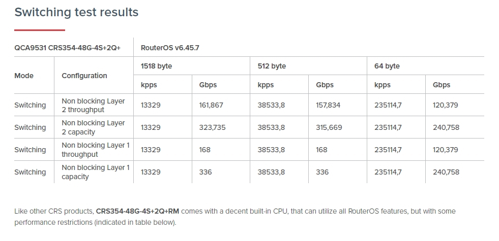 Celková non-blocking propustnost je 168Gbps, switchovací kapacita 336Gbps a forwarding rate dosahuje 235Mpps.