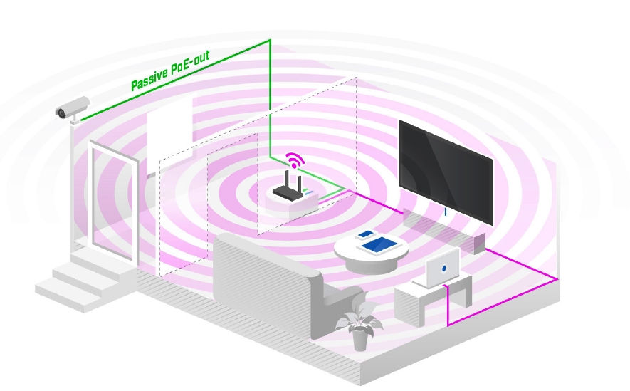 Router dále disponuje PoE-out portem umožňující PoE napájení připojeného aktivního prvku.
