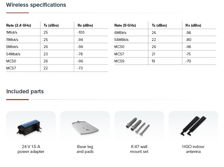 Dodáváno s napájecím adaptérem 24V 1.2A v produktovém balení, WiFi router lze napájet také přes PoE.