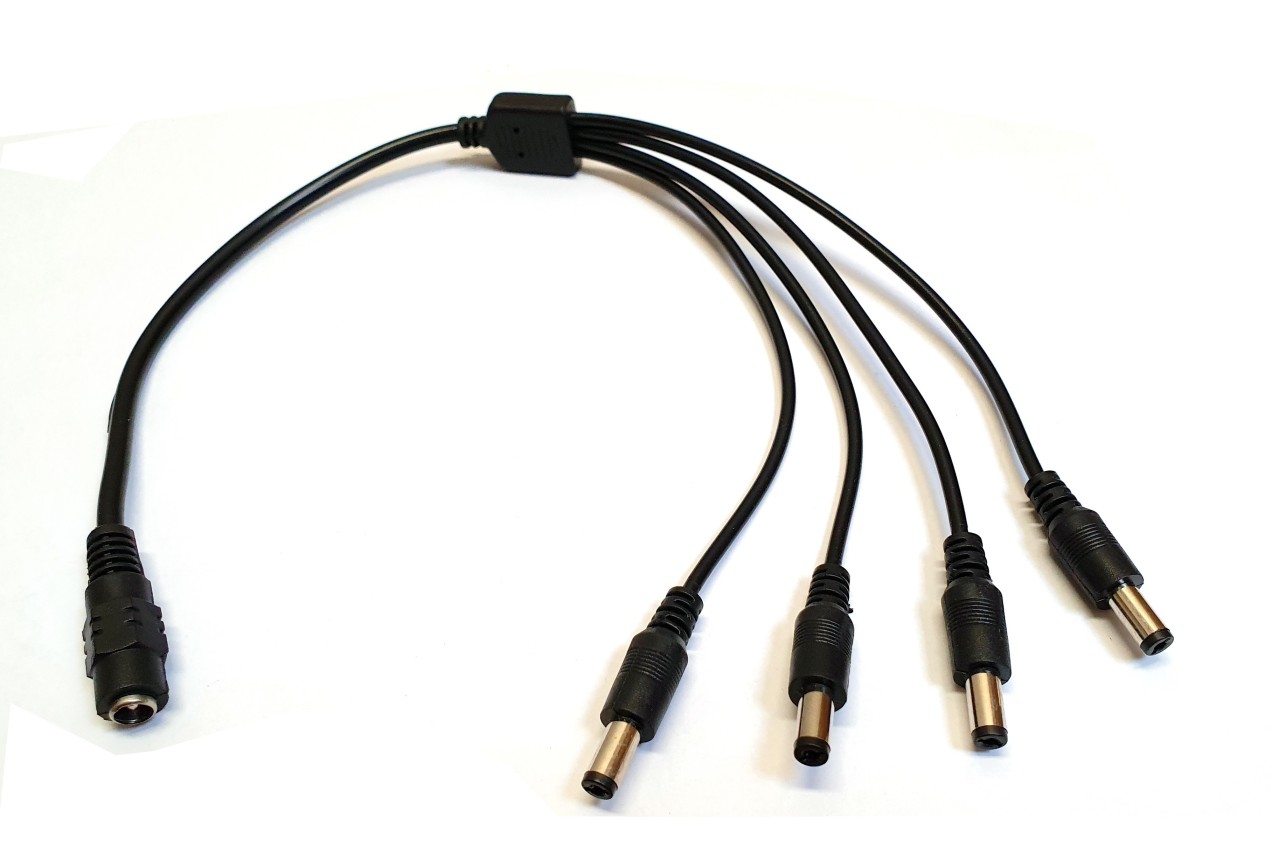 Kabelový DC rozbočovač s jedním vstupním a čtyřmi výstupními jacky.