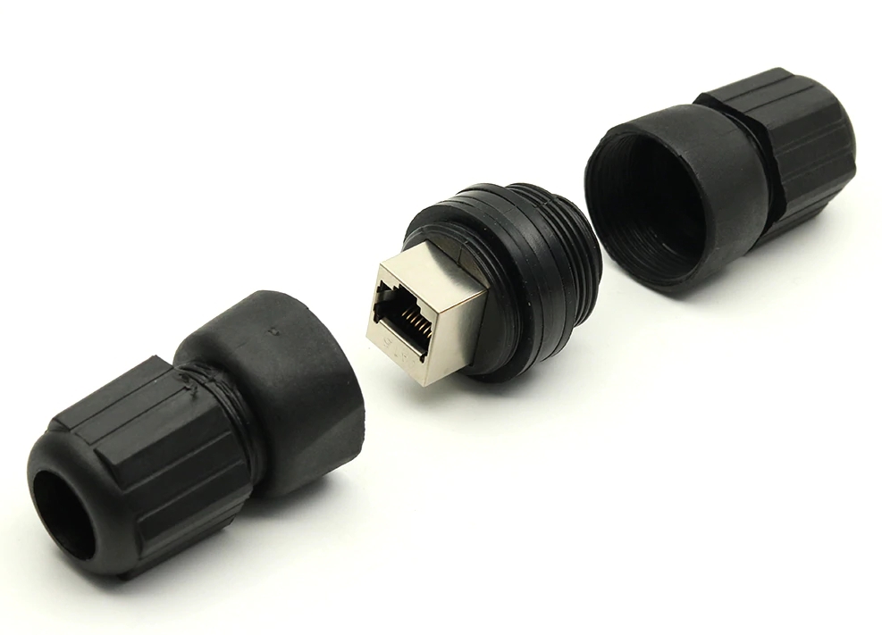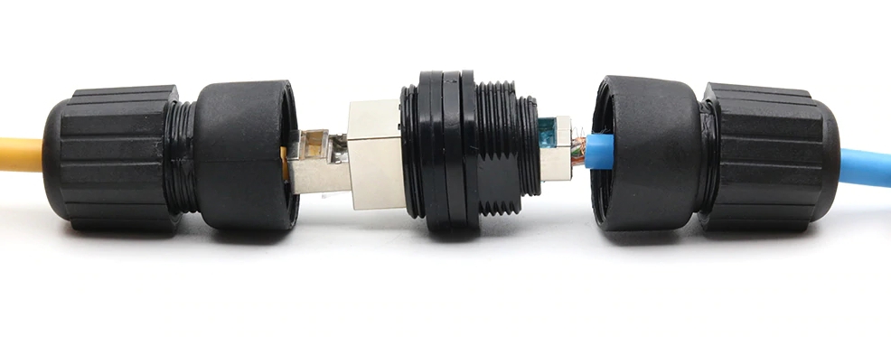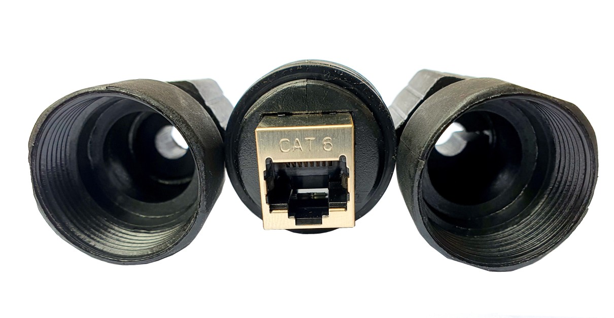 Stíněná RJ45 spojka M22 na ethernetový kabel Cat5 ve vodotěsném krytí IP67 certifikace umožňuje vodotěsný spoj ethernetových kabelů instalovaných v exteriéru.