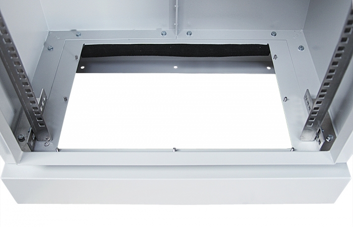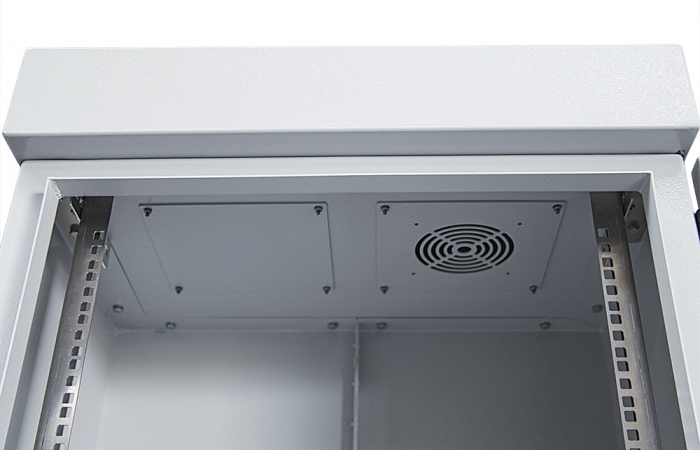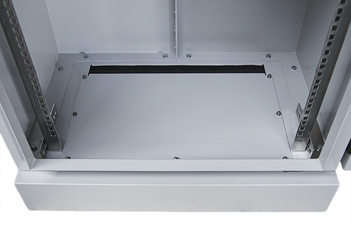 Uvnitř skříně jsou nastavitelné RACK lišty pro montáž všech zařízení, patch panelů a dalších zařízení. V horní části je montážní prostor vyhrazený pro ventilátorový pannel, ve spodní části je odnímatelná podlaha s otvory.