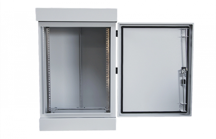 Venkovní hliníková skříň 15U STZ 962/625/400 IP34 pro telekomunikační zařízení, určená pro montáž s rámem na beton.