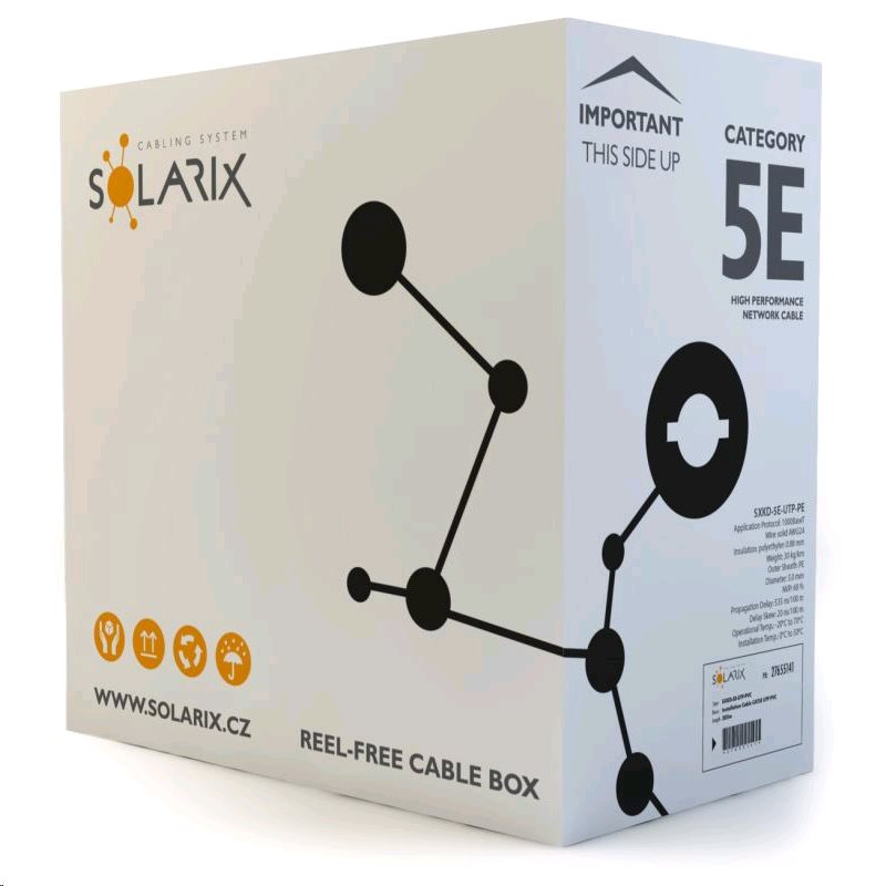 Instalační kabel Solarix s označením SXKD-5E-UTP-PE je spolehlivý venkovní nestíněný kabel kategorie 5E, který je určený pro provoz ethernetových protokolů, včetně 2.5GBASE-T a 5GBASE-T*. Konstrukce kabelu je U/UTP, typ pláště UV stabilní PE s třídou reakce na oheň Fca a stupněm krytí IP67. Vodiče kabelu jsou vyrobeny z kvalitního měděného drátu s čistotou mědi 99,97%. Kabel bez problémů splňuje požadavky z mezinárodních standardů ISO/IEC 11801, EN 50173 a ANSI/TIA 568.2-D. Stejně jako ostatní kabely Solarix, je i kabel SXKD-5E-UTP-PE značen metráží po 1 m v rozsahu od 0 do 305 m. Kabel je dodáván ve vysoce odolném třívrstvém leštěném kartónovém boxu (vždy barevně odlišeném podle typu kabelu), na kterém jsou uvedeny všechny nezbytné produktové informace, včetně čárových kódů, výrobní šarže, popisu a nejdůležitějších technických parametrů.Při instalaci do země doporučujeme vždy použít HDPE chráničku.