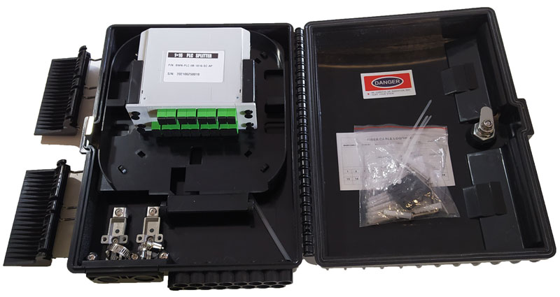 FTTH distribuční box pro instalaci 1:16 splitteru se používá jako koncový bod pro přívodní konektivitu. V tomto boxu lze provádět spojování, rozdělení a distribuci optických vláken.