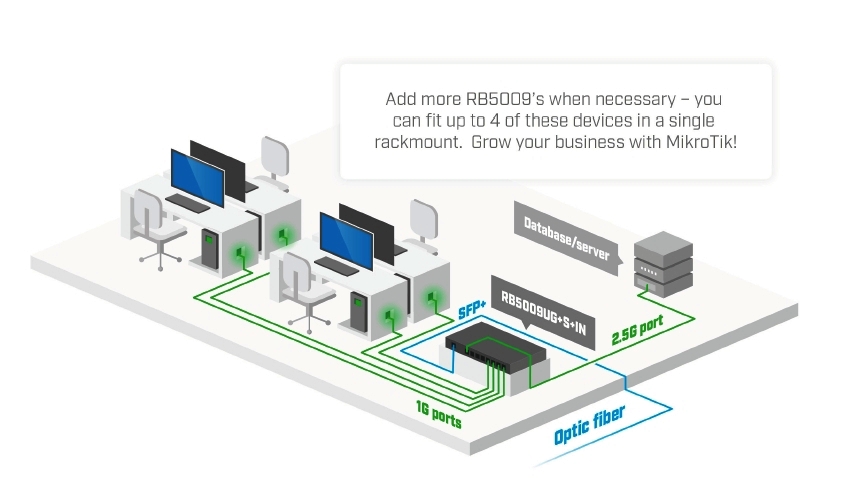 Tato nová verze modelu RB5009 - výkonného a robustního domácího routeru - stále vyniká rychlostí, výkonem a odolností. Pro připojení optických vláken je k dispozici šachta 10 Gigabit SFP+, gigabitový Ethernet i 2,5 Gigabit Ethernet.