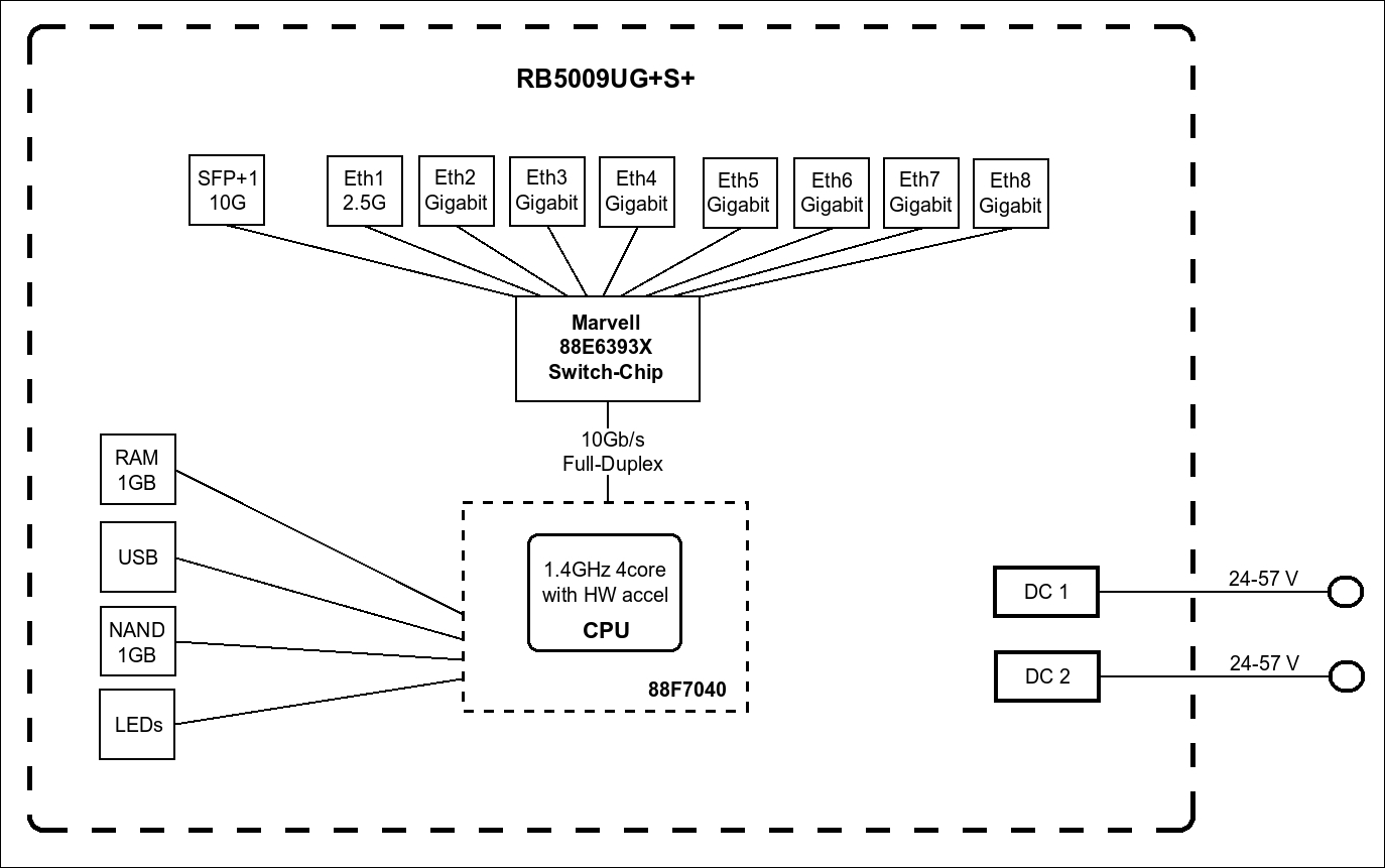 Všechny porty jsou připojeny k výkonnému switch-chipu z rodiny Marvell Amethyst a 10Gbps full-duplex linkou k Marvell Armada Quad-core ARMv8 1.4 GHz procesoru.
