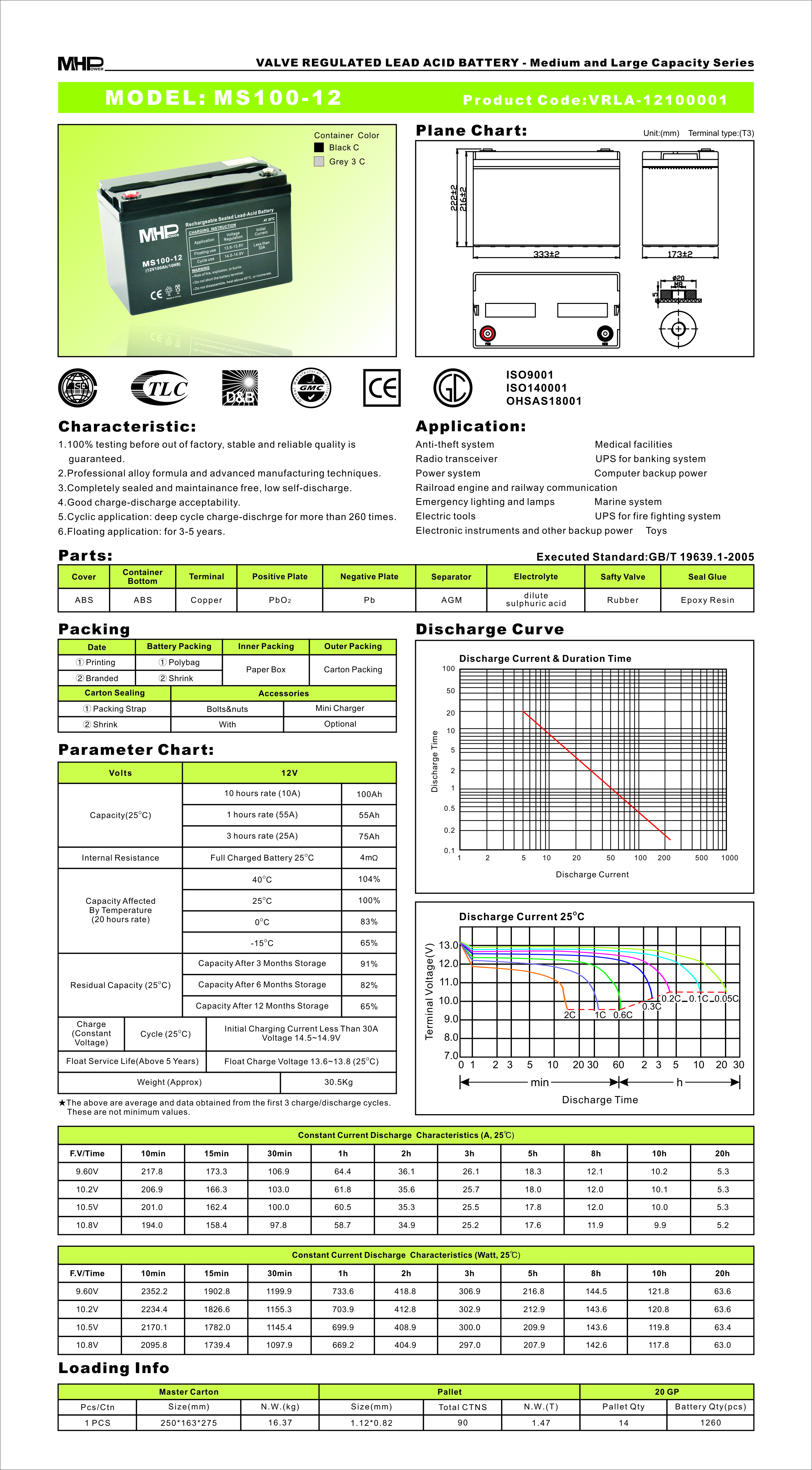 MHPower battery • MS100-12 • MHPower olověný akumulátor AGM 12V/100Ah, Terminál T3 - M8