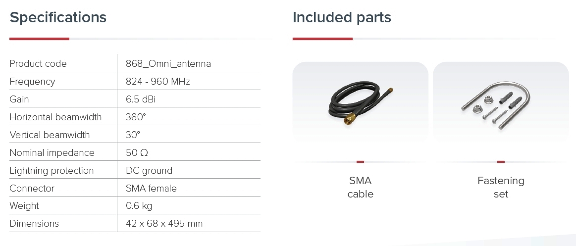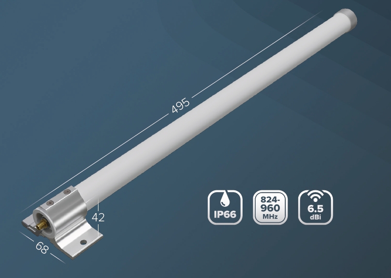 Kit obsahuje externí 6.5dBi Omni anténu pro frekvenční pásmo 824-960 MHz s instalačním příslušenstvím.