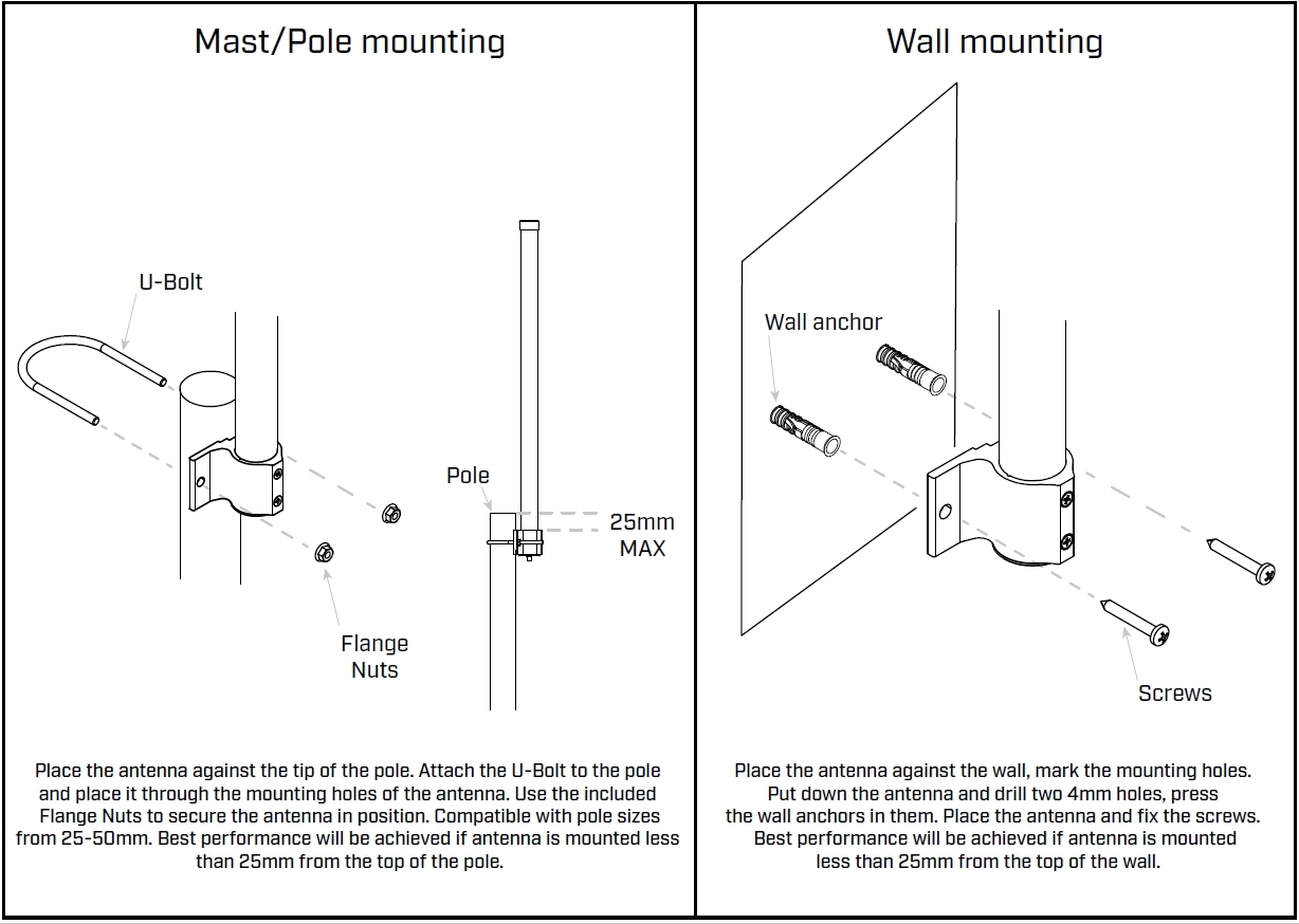 Dodávána spolu s 1m dlouhým SMA/SMA redukčním kabelem a držákem na stožár (o průměru 30-50mm).