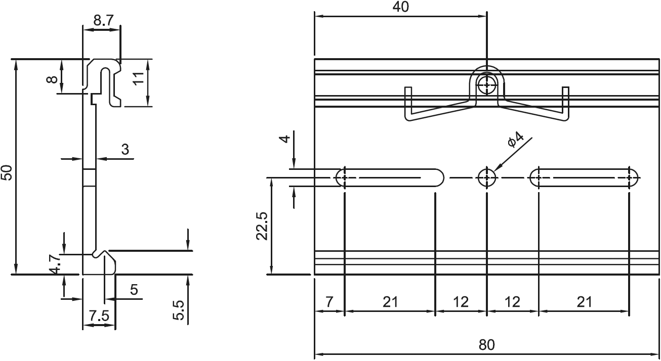 Široká montážní DIN příchytka úzká pro montážní úhelníky a desky.