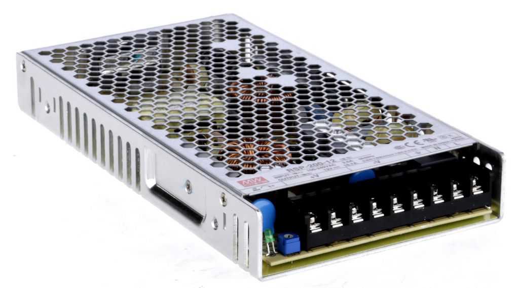 Značkový průmyslový uzavřený modulový spínaný napájecí zdroj Mean Well s výstupním napětím 12V a výstupním výkonem 200W určený zejména k napájení většího počtu aktivních prvků.