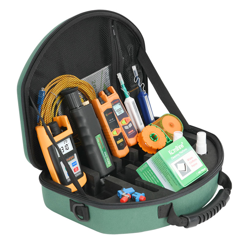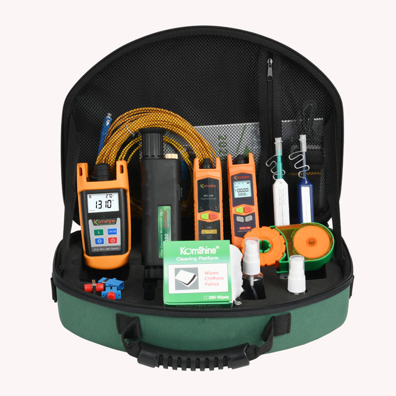 V oficiálním zastoupení výrobce Komshine pro ČR si vám dovolujeme nabídnout kvalitní příslušenství pro výstavbu optických sítí ve skvělém poměru cena/výkon. Sada nástrojů pro výstavbu optických sítí KLT-15D je profesionální sestava nářadí pro testování ztrát optických vláken a údržbu telekomunikačních systémů. Součástí nářaďového sortimentu je i širokopásmový měřič výkonu (Optical Power Meter) a vizuální detektor poruch (Visual Fault Locator). Specifikace