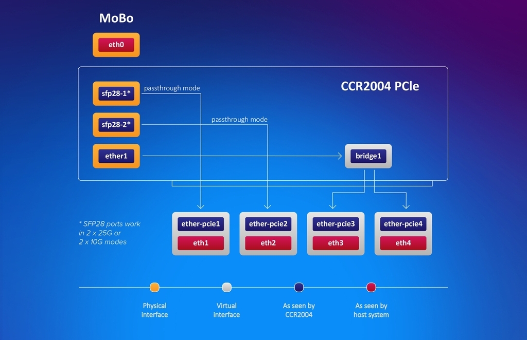 Ve výchozím nastavení se rozhraní PCIe zobrazí jako čtyři virtuální ethernet rozhraní. Dvě rozhraní v režimu průchodu do klecí 25G SFP28.