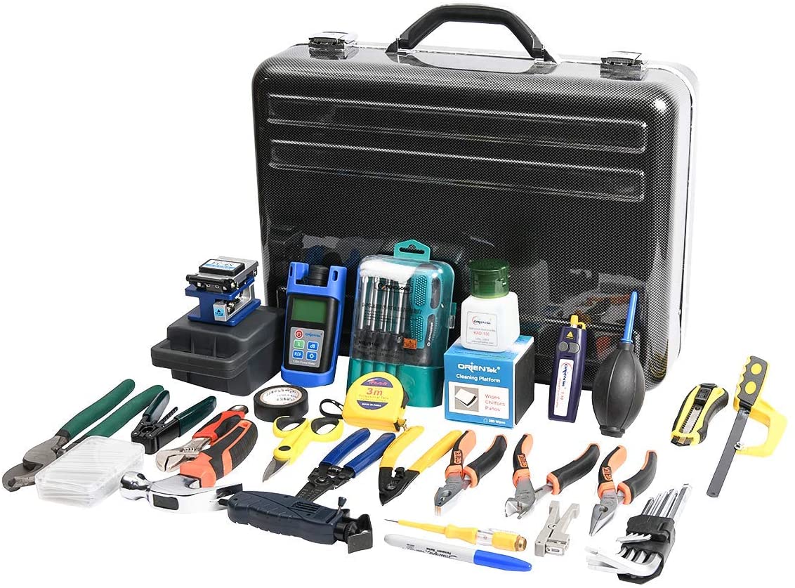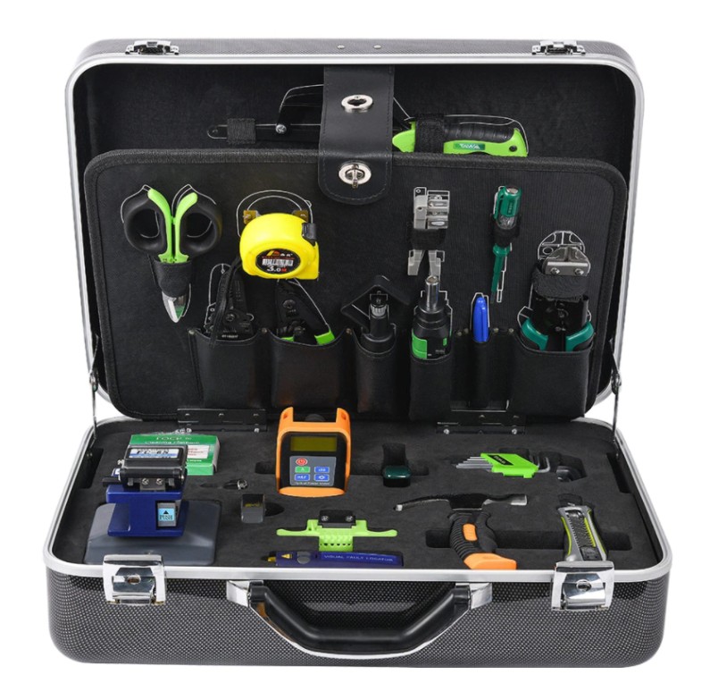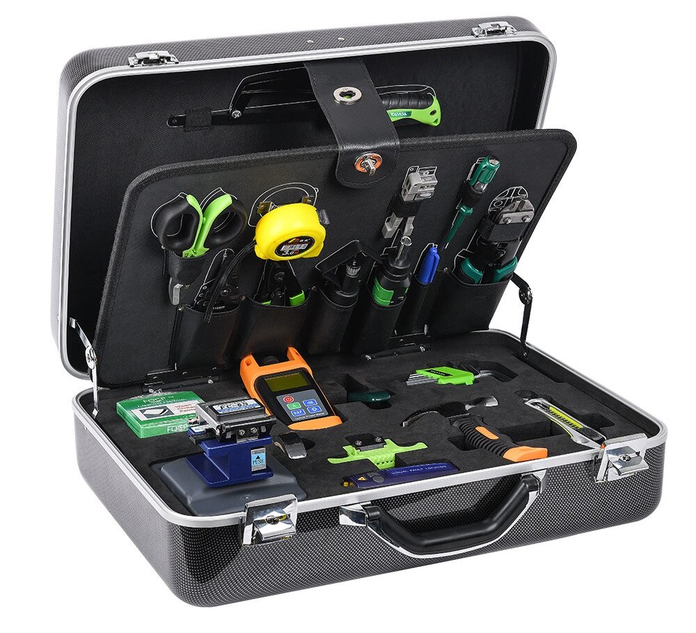 Obsah nářadí: • Precizní lámačka optických vláken • Měřič optického výkonu KPM-25m • Vizuální vyhledávač poruch KFL-10 • Elektro páska • Platforma pro čištění optických vláken • Odizolovač kabelů • Šestihranný klíč • Kladivo • Přístupový nástroj pro střední rozteč • Nůž • Kevlarový nůž • Odstraňovač optických vláken • Odstraňovač optických vláken se třemi otvory • Kulatý štípač kabelů RCS • Šroubovák (vestavěná hlava \ nástavec) • Odizolovač koaxiálních kabelů 45-162 • Zkušební tužka • Značkovací pero • Štípací kleště na šrouby • Páskový metr • Diagonální štípací kleště • Kleště na ocelový drát • Kleště s dlouhým nosem • Klíč • ruční pilka • Přenosné pouzdro - kufřík (materiál EVA s tvrzeným povrchem)