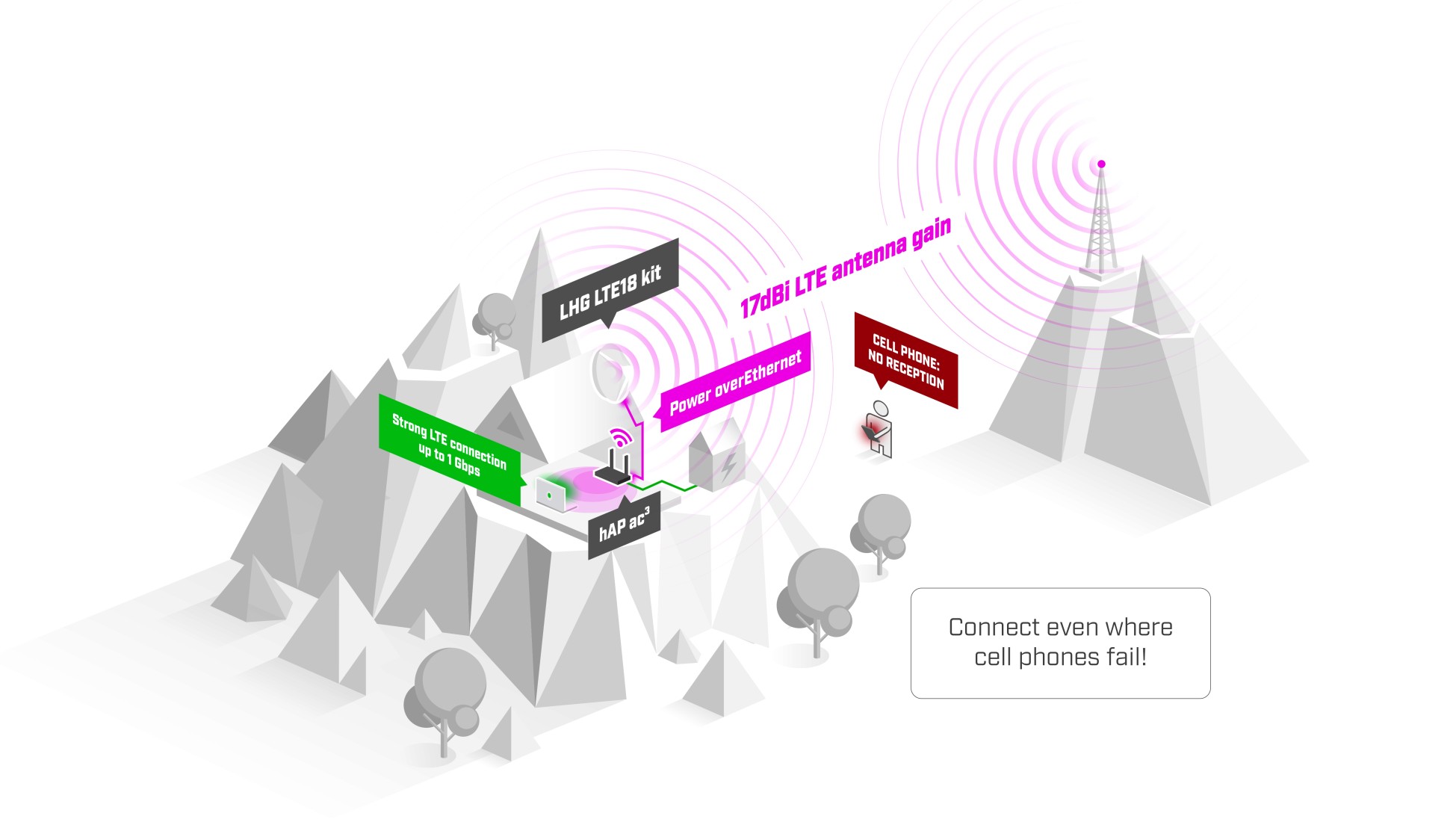Díky velké anténě s vysokým ziskem 17 dBi se sada LHG LTE18 dokáže připojit k mobilním věžím i v extrémně odlehlých lokalitách.