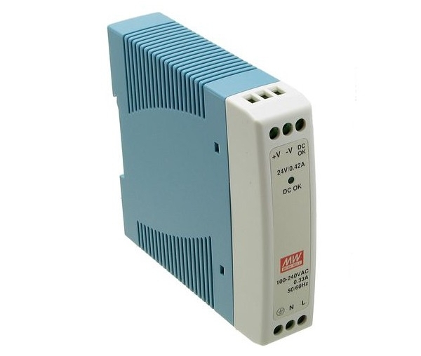 Profesionální spínaný napájecí zdroj Mean Well na DIN lištu s rozšířeným rozsahem provozních teplot s výstupním napětím 12V a výstupním proudem 10W pro aktivní prvky s odpovídajícím napájecím rozsahem.