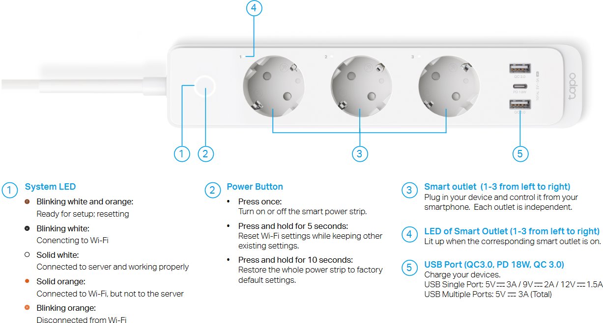 Tapo P300 je vzdáleně ovladatelná 3-zásuvková prodlužovačka s WiFi a 1.5 dlouhým přívodním kabelem, Bluetooth, doplňkovými napájecími USB porty (2x USB, 1x USB-C, max. 18W), krásným jednoduchým designem a schopností vypnout/zapnout zařízení na každém ze 3 portů zvlášť s celkovým výkonem 2300 W, monitorovat spotřebu, nastavovat časovač na pravidelné vypnutí/zapnutí v určité hodiny a to vše odkudkoliv a kdekoliv. Podpora Alexa, Google Assistant a Samsung SmartThing.